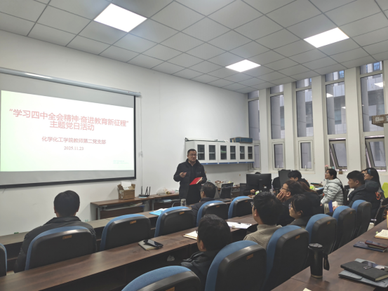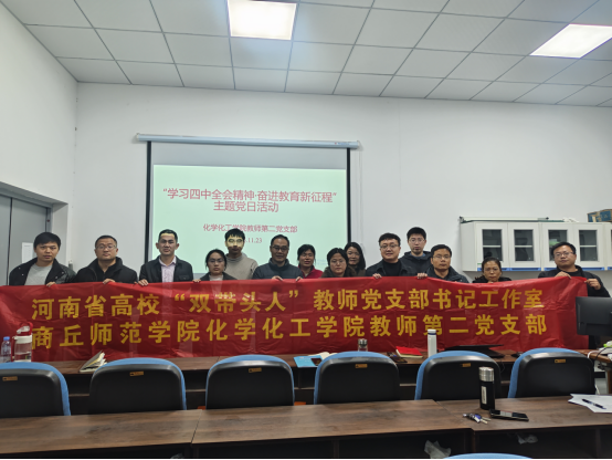 2025年11月23日,商丘师范学院化学化工学院教师第二党支部成功举办“学习四中全会精神·奋进教育新征程”主题党日活动。活动聚焦学习贯彻党的二十届四中全会精神,组织全体党员认真研读《中共中央关于进一步全面深化改革、推进中国式现代化的决定》,深刻领会“新阶段、新理念、新格局、新实践”这一“四个新”重大部署的战略意义和丰富内涵。会议强调了将思想和行动统一到全会精神上来的重要性,为在新征程上推动学院事业发展筑牢思想根基。